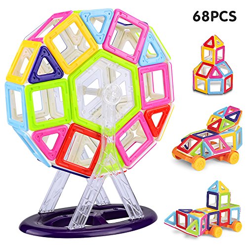 -. Feature : 【Total 68 Pieces】24 squares, 12 triangles, 1 rectangle, 2 trapezoid, 2 Hexagons, 2 cartwheel,17square in panel, 8ferris accessories. 32 x Stickers(26 letter cards, 6 animal cards) and an instruction included for your reference. (Note: this Magnetic Building Blocks comes with random colors) / 【Safe Material】The Magnetic Building Blocks is made from non-toxic, high quality ABS food grade plastic and conform to CE, EN71, ASTM and HR4040. Smooth edge of each tile will never hurt baby's little hands. / 【Play and Learn】This building toys set can be combined into many patterns, not limited to ferris model, could help kids learn colors and shapes while playing, cultivate their teamwork ability, practical ability, imagination and creativity. / 【Magnetic and Easy Clean Up】Powerful magnets make playtime more fun, the magnetic tiles connect to each other strongly with firm construction, magnetic effect will not changed after long use; easy to clean them up and storage since magnet sticks together. / 【Best Gift for Kids】It can be a kid's Birthday, Children's day, parties gift, or as a prize.