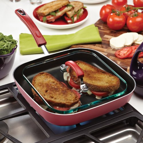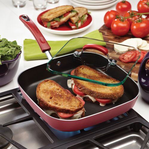 Grill up sammies the whole gang will love with the Rachael Ray Hard Enamel Nonstick 11-Inch Square Deep Griddle and Glass Press. Complete with a solid, shatter-resistant glass sandwich press, this deep skillet is the perfect way to make crowd pleasers like Rachael's Spanish Ham and Cheese Panini without any grill marks, just the way she likes! The pan also features durable construction that promotes even heating, helping to reduce hot spots that can burn foods and a sturdy, colorful porcelain enamel exterior. Long-lasting nonstick provides superior food release, making cleanup a snap even after making cheesy Panini sandwiches. The colorful grippy handle offers a comfortable grasp and is dual riveted for extra strength. Oven safe to 350 Degree F, the griddle and press are dishwasher safe and partners well with many other items in the Rachael Ray collections. Im-"press" friends and family with perfectly grilled paninis and sandwiches using this Rachael Ray Hard Enamel Nonstick 11-Inch Square Deep Griddle and Glass Press.Feature