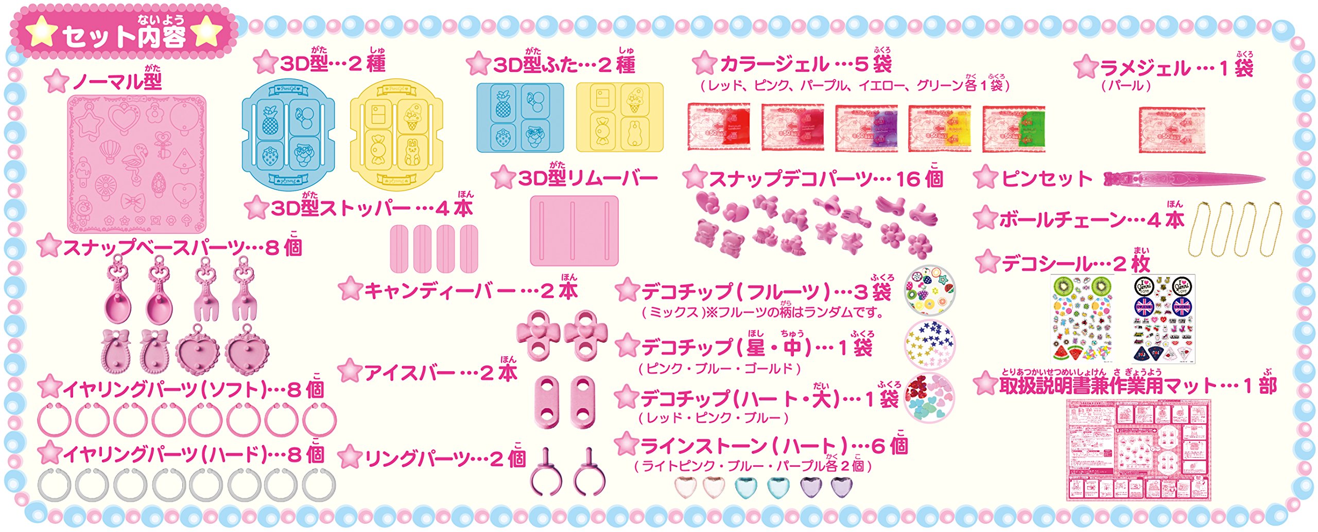 [Contents of set] Normal type 1 piece 3D type 2 piece stopper 4 piece remover 1 piece Color gel 5 bags Rame gel 1 bag tweezers 1 line rhinestone 6 pieces deco chip 3 bags deco seal 2 pieces snap base parts 8 pieces snap deco parts 16 pieces rings parts 2
