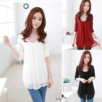 2013秋新款雪纺衫女装长袖打底衫圆领包臀双层清凉上衣雪纺T恤衫