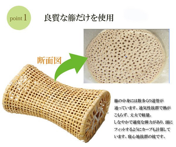 ナチュラルなひんやり籐枕です。表面は天然素材100%の籐を使用しています。適度な硬さで、ひんやりスベスベした肌感触です。中は空洞になっておりますので熱がこもらず、通気性抜群です。本商品は現地ベトナムにて1つ1つ手作業で編みこんで作っています。※本商品は天然木を使用しておりますので商品によって細かいバリ(ささくれ)等がある場合がございます。身体や衣類などを傷つけないようにご注意下さい。ささくれは、ハサミや爪切りで切ると簡単に取り除けます・