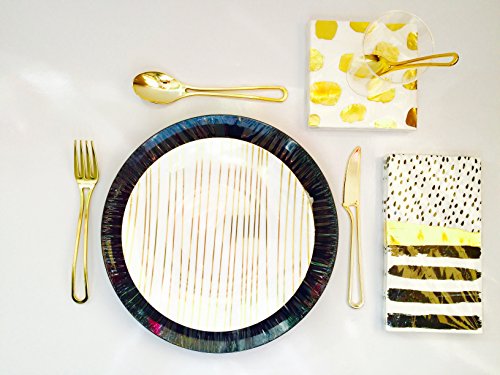 - Party Pack for 30 People - 332 Piece Bundle Includes In Premium Quality ; 30 Black Dinner Plates , 30 White With Shiny Gold Lined Salad Plates , 40 - 8 Oz. Clear Tumblers, 32 Guest Towel Style Printed Napkins Black / White With Gold Foil, 40 White Beverage Napkins With Gold Foil Printing, 40 Gold Knives , 40 Gold Forks, 40 Gold Spoons, 40 Gold Tea Spoons