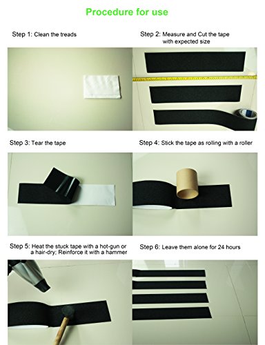 - Follow the instruction actually to apply -- STEP 1: Clean and dry the surfaces of the treads; STEP 2: Measure and Cut the tape with expected size; STEP 3: Tear the tape; STEP 4: Stick the tape as rolling with a roller; STEP 5: Heat the stuck tape with a hot-gun or hair-dry; Reinforce it with a rubber hammer; STEP 6: Leave them alone for 24 hours. PS. They are removable without residue, just peeled off with hands or scrapper, better with an aid of a hot-gun.