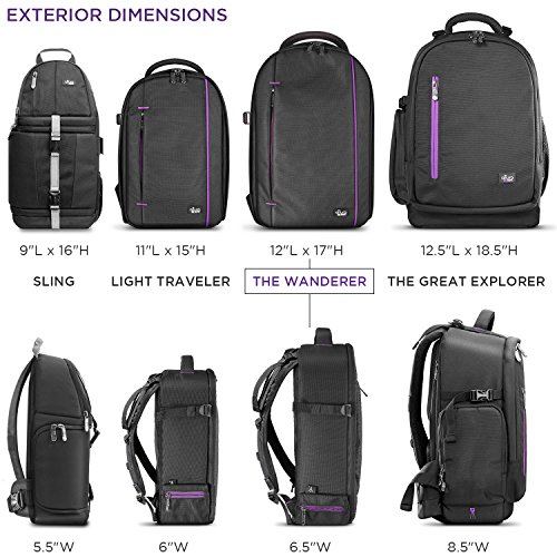 The Wanderer by Altura Photo is a great high capacity mid-sized camera pack with premium features at an exceptional value. The Wanderer is tough, but lightweight, and features a classic DSLR backpack design with contemporary styling. Its durable water-repellant exterior and exceptional internal padding ensures that your gear is protected and safe while the padded ergonomic shoulder harness evenly distributes the load for all-day carrying comfort.