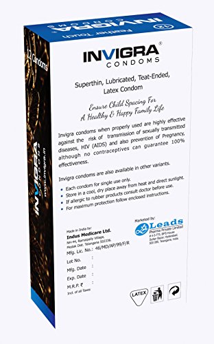 Studio : Leads Pharma Private Limited Publisher : Leads Pharma Private Limited Binding : Health and Beauty Product Description 12 super thin condoms for a highly sensitive and heavenly romance. Invigra condoms when properly used are highly effective against the risk of transmission of sexually transmitted diseases, HIV(AIDS) and also prevention of pregnancy, although no contraceptives can guarantee 100% effectiveness. Invigra Condoms are also available in other variants. ? Each condom for single use only ? Store in a cool, dry place away from heat and direct sunlight ? If allergic to rubber products consult doctor before use ? For maximum protection follow enclosed instructions 0