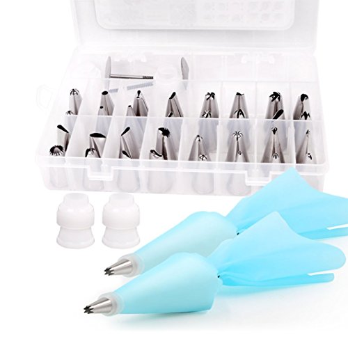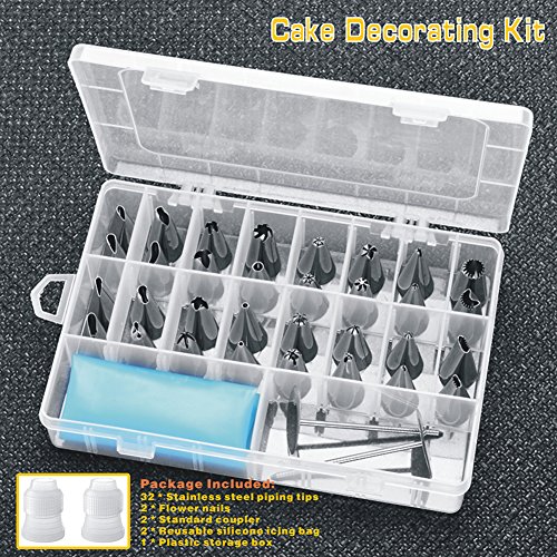- Luxury cake decorating supplies kit: Including 32 PCS stainless steel cake piping tips, 2 standard couplers, 2 flower nails,2 reusable silicone icing bags,which you can create all types of patterns on cake, cupcakes.Great Thanksgiving Gifts