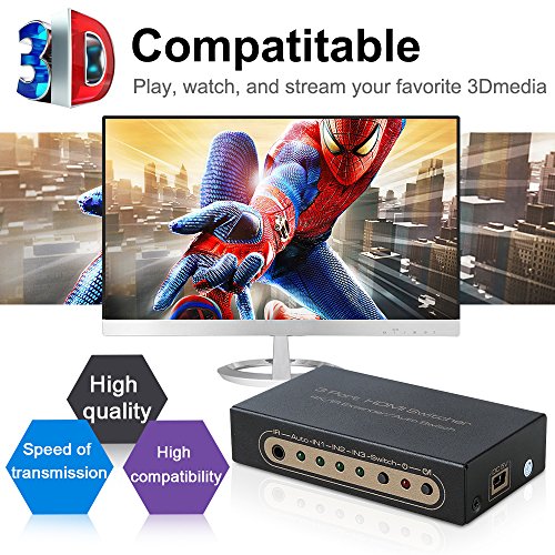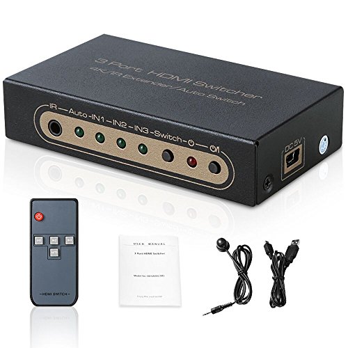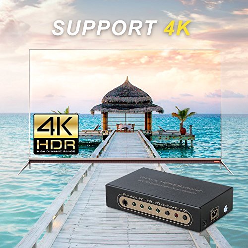 Studio : CAMSTRO Publisher : CAMSTRO Binding : Electronics Product Description HDMI Switcher Box Specification: HDMI switch version: HDMI 1.4 Maximum transmission band width: 225MHz Maximum working current: 350mA Working humidity range: 5 to 85%RH (no condensation) Input output DDC signal: 5Vp-p(TTL) Working temperature: o to 40℃ HDMI Resolution: 24/50/60fs/1080P/1080i/720p/576p/576i/480P/480i,24/30/2160P Video Color Format: 24/30/36bit/1080P/1080i/720p/576p/576i/480P/480i,24bit/2160P Audio Format: DTS-HD/Dolby-trueHD/LPCM7.1/DTS/Dolby-AC3/DSD Features: 1. This HDMI switcher supports 2 ways of switching modes: IR remote control switch and manual switch. 2. It supports 3D features and up to 4K x 2K resolutions for crisp, clean, powerful displays, giving you a seamless transfer of ultra HD display. 4K HDMI Switcher will include: 1 x HDMI Switcher Box 1 x USB Power cable 1 x Infrared Receiver 1 x Remote Control (with batteries) 1 x User Manual Note: If you have any problem about the HDMI switcher, please feel free to contact us via amazon message directly. Definitely respond within 24 hours.