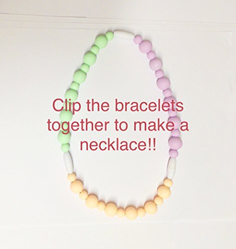 Product Description Set of three silicone beaded bracelets. Designed to fit most toddlers and children (see photos of sizing). Safety clasp that pops open under pressure. Safe to chew on for sensory or teething needs. Approx. 7 inches long unclasped. Not for aggressive chewers. 0