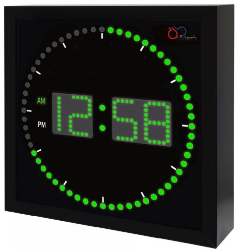 Bring modern LED technology to your wall This DBTech Digital Circling LED Clock perfect for the office, the home kitchen, family room or dorm room. With a large and sleek design, the DBTech clock has a beautiful display that shows clearly the time with AM and PM indicator lights.