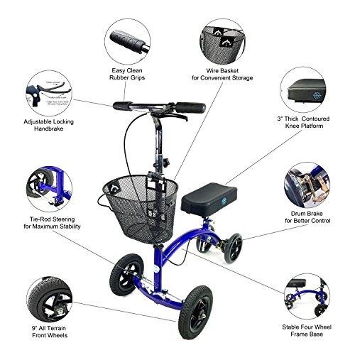 These steerable knee scooters offer an advanced automotive style tie-rod steering mechanism (not available on most knee walkers) and an adjustable locking handbrake.