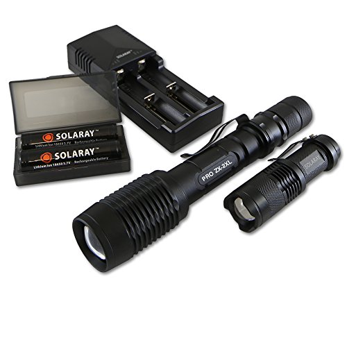 Kit includes a Solaray Pro ZX-2XL Flashlight, Professional Multi-Purpose Dual Battery Charger with Overcharge Protection, 2 powerful Premium Solaray Rechargeable 18650 Lithium-Ion Batteries with Circuit Protection, and Deluxe Gift Box. The Solaray Pro ZX-2XL Kit makes the Perfect Gift!
