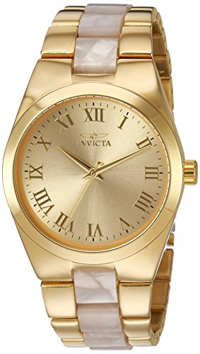 Invicta 20481 Angel women's watch features a 38mm wide and 10mm thick yellow gold plated solid stainless steel case with a fixed bezel and textured push-pull crown. Invicta 20481 is powered by Japanese TMI PC21 quartz movement. This beautiful watch also features a shiny sunray gold tone dial with gold tone luminous hands and Roman numeral hour markers, scratch resistant flame fusion crystal and water resistant to 100 meters. Invicta 20481 is equipped with a 24mm wide yellow gold plated solid stainless steel and white pearlized resin bracelet with a fold over push button clasp. Invicta 20481 women's Angel gold tone dial yellow gold steel & pearlized resin bracelet watch is brand new and comes in an original Invicta gift box and is backed by a 5 year limited warranty.Feature