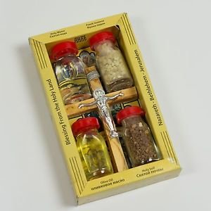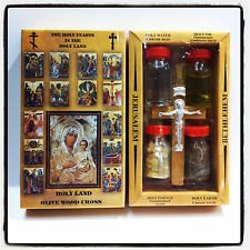 Holy Land Set 5 in1 Olive Wood Cross Set with 4 Bottles - Anotinting Oil, Jordan River Water, Holy Earth and Incense