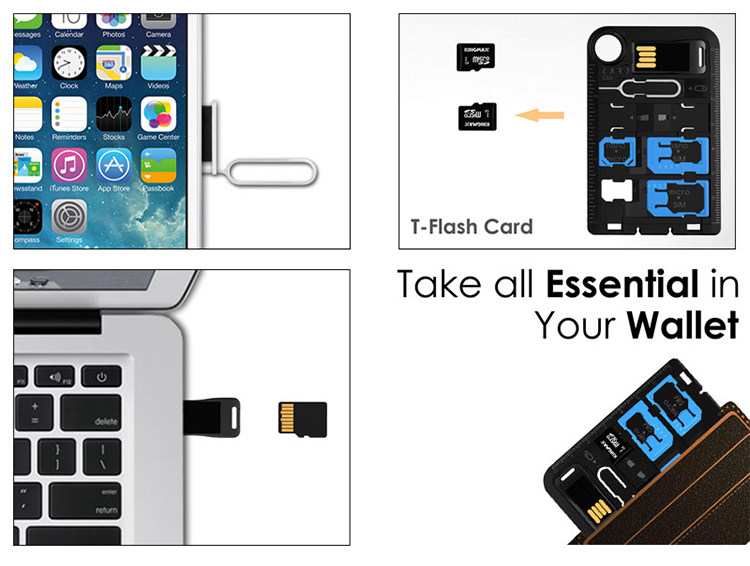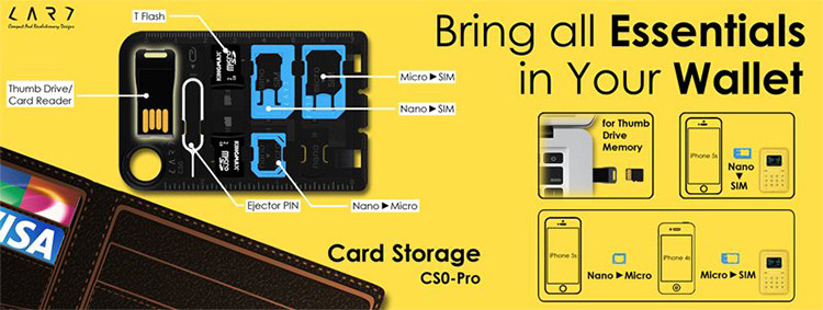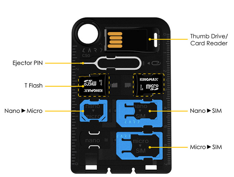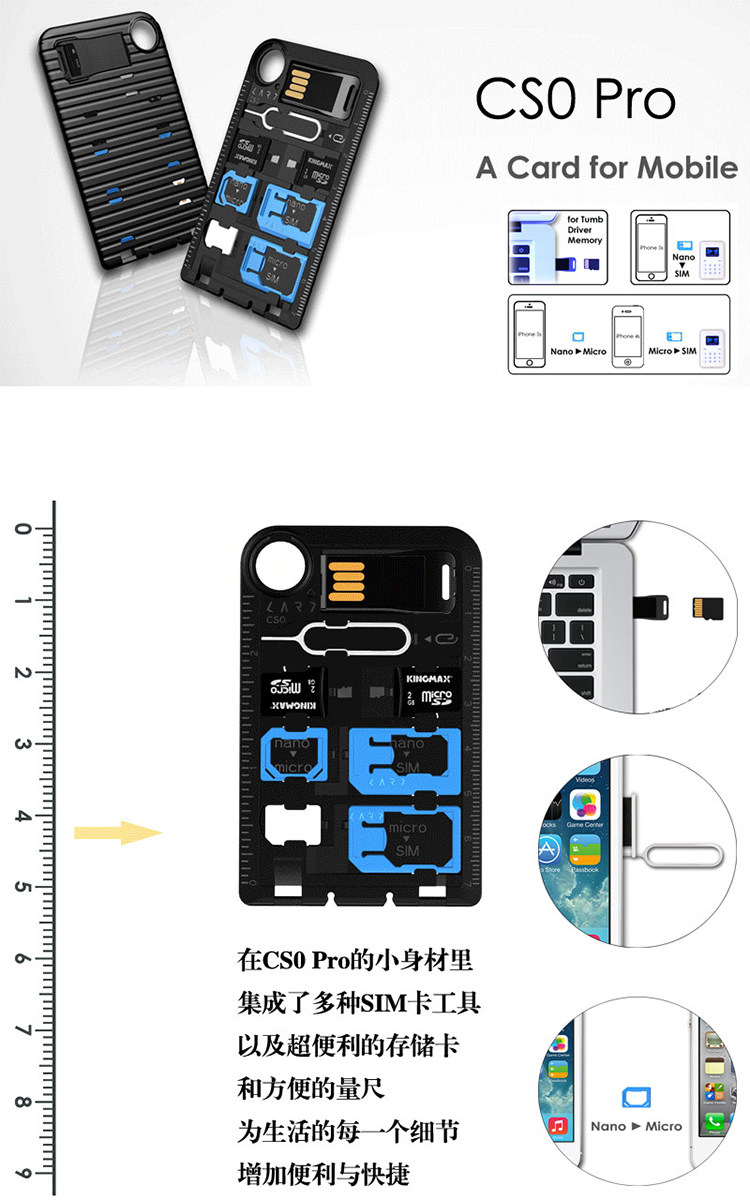 继成功推出全球最轻薄手机CM1之后,新加坡CARD品牌再出新招,针对现在人们人手数台移动装备,各种nano、micro卡层出不穷的现实,设计了这款名为CS0 Pro的小装备,在它薄薄的身躯里,集成了Ejector PIN取卡针及NANO、Micro和正常尺寸SIM卡转换工具,同时还将闪存卡集成于上,可以选择2GB、8GB、32GB三种闪存大小,侧边有公制和英制直尺,方便临时测量。