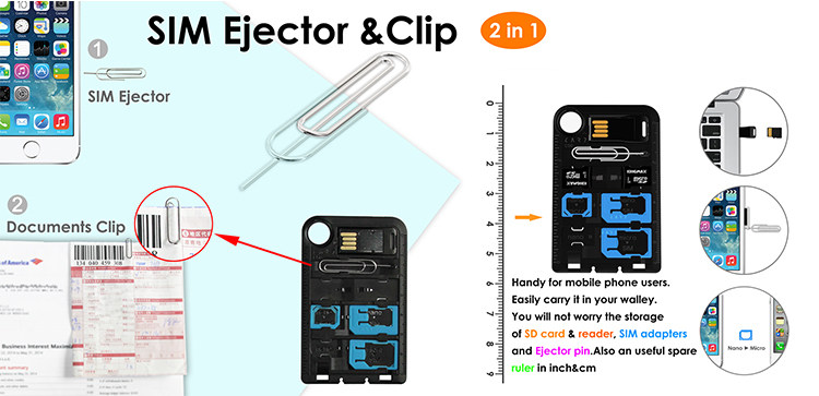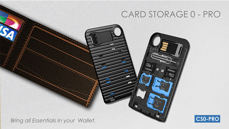 继成功推出全球最轻薄手机CM1之后,新加坡CARD品牌再出新招,针对现在人们人手数台移动装备,各种nano、micro卡层出不穷的现实,设计了这款名为CS0 Pro的小装备,在它薄薄的身躯里,集成了Ejector PIN取卡针及NANO、Micro和正常尺寸SIM卡转换工具,同时还将闪存卡集成于上,可以选择4GB、8GB、16GB、32GB四种闪存大小,侧边有公制和英制直尺,方便临时测量。