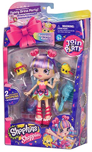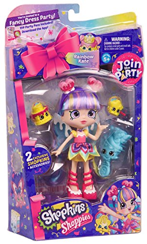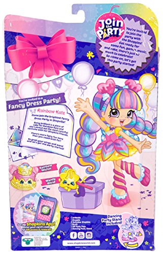 It's time to party in Shopville! It's the biggest party ever, and all Shopkins and Shoppies are invited! Each Shoppie is themed around a different type of party, dressed from head to toe in the most exciting outfits! Come join the brightest costume party in Shopville! Being brilliant is a piece of cake for Rainbow Kate and she’s been baking some colorful creations with her Shopkins friends. There’s more dress-up fun here than you could wish for! So get creative with a costume and let’s get this party started! Rainbow Kate comes with their own brush, 2 exclusive Shopkins, a Party Dancefloor Twirl Stand, and a VIP Card that unlocks bonus content on the Welcome to Shopville App!Feature