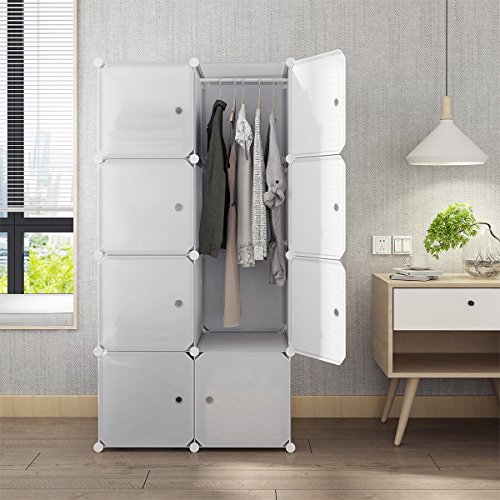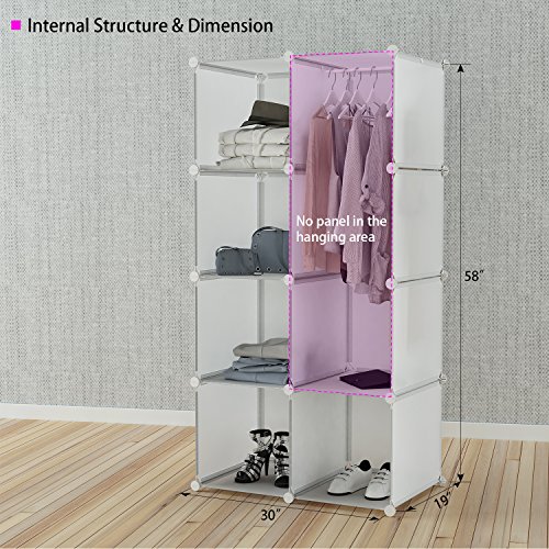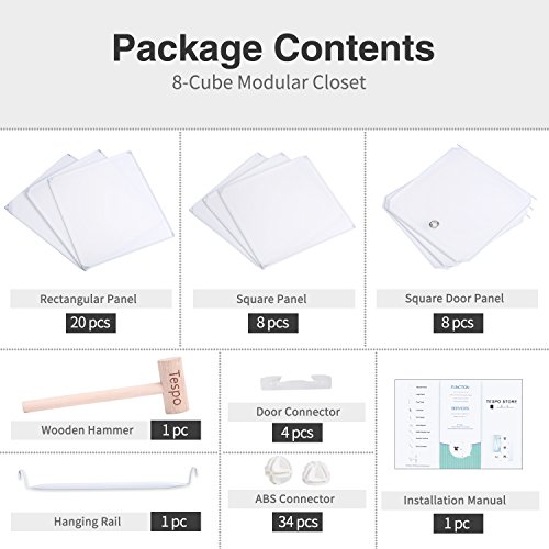 Studio : Tespo Publisher : Tespo Product Description Please search for "Tespo Closet" on Youtube for detailed assembly instruction. About Us Tespo portable wardrobe will help make your home neat, tidy. DIY assembly makes it meet various demands. It's also very easy to assemble and offers sturdy result. Dimensions for each cube: - 15"(W) x 19"(D) x 15"(H) Dimensions for the wardrobe(connectors included): - 30"(W) x 19"(D) x 58"(H) Material type: - ABS connector - PP plastic panel - Rust proof steel frame Components: - Rectangular Panels : 20 pcs - Square Panels : 8 pcs - Square Doors : 8 pcs - ABS connectors: 34 pcs - Door Connectors: 4 pcs - Hanging Rod: 1 pcs - Wooden hammer: 1 pc - Installation instruction: 1 pc Notes - Please make sure all poles reach the bottoms of plastic connector holes. - If you have left over parts after assembly please store them away. - For the safety of small children keep the small extra pieces out of reach. 0