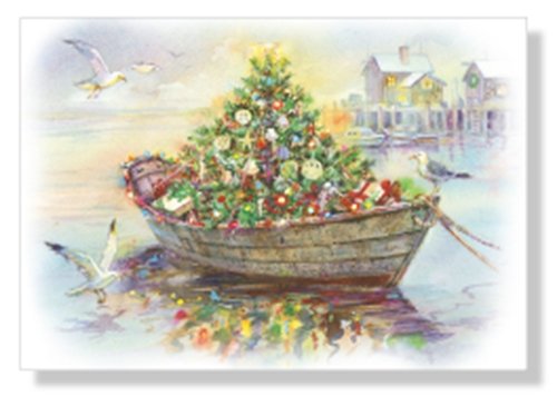 -. Feature : Fine Nautical/Coastal Designs / Verse reads "Warmest greetings of the Christmas season and every good wish for the coming year." / Embellished with foil and embossed treatments. / 18 Cards and envelopes / Boat loaded with Christmas tree, lights and presents.