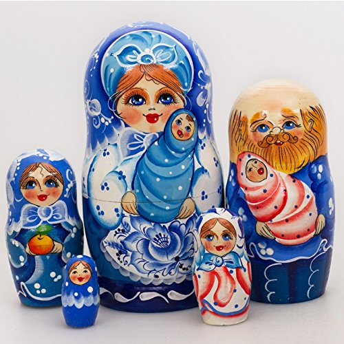 -. Title : Matryoshka 5pcs Happy Family Gzhel New Beautiful Blue Wooden Russian Nesting Dolls Gift Matreshka Handmade