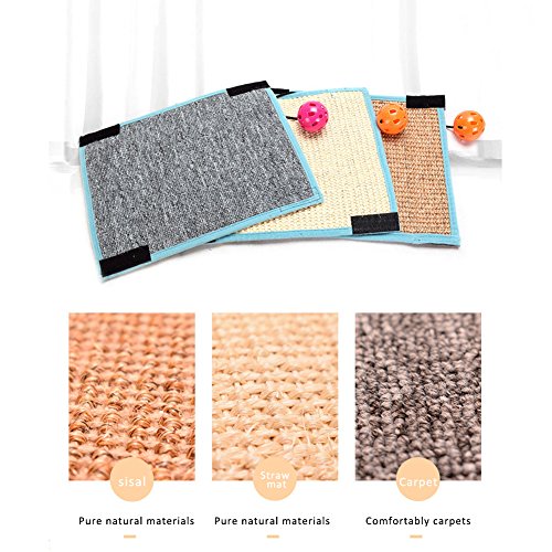 Features: 1. This product of three styles sisal mat / straw mat / carpet is comfortable to protect cats' claws from injury. 2. It can be rolled up vertically or horizontally, which makes it suitable for different table legs. 3. It is equipped with funny bells. The cats can play with it while grinding their claws. 4. Can be fixed on the chair legs, table legs and other places to protect the furniture from scratches. Parameters: Size: about 31.5 * 24.5cm / 12.40 * 9.65in Note: The ball random color delivey. Material: sisal / straw mat Packing List: 1 * cat scratch mat 0