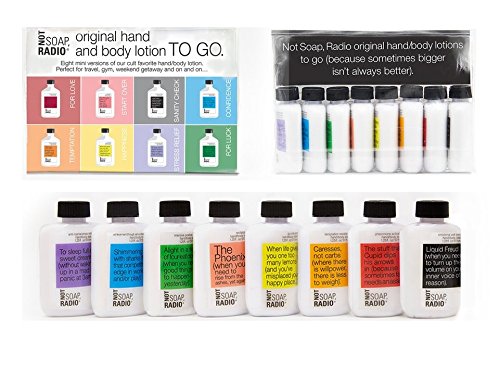 Bigger, better, happier. Our exclusive mega-mini lotion set, originally created for Ipsy, now available. More to love...lotions are a little bigger than our original lotion travel/gift kit. Set includes seven (1.7 fl oz): Cupid, Four-Leaf Clover, To sleep, Bathing w/ Sharks, Liquid Freud, The Phoenix - and for the first time and only available in this set - When life gives you one too many lemons, joy-inducing lotion. Go big, be happy.