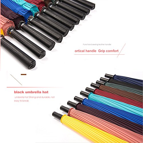 ■【素材】高級ポリエステルポンジ(デュポン社テフロン加工)、鋼、グラスファイバー、人工皮革(PUレザー)。 UV防止加工付きで、晴雨兼用仕様。鋼製のシャフトに加え傘骨に「グラスファイバー」を採用することで、強度と柔軟性の両面を実現しています。本製品の特徴である「24本骨」構造による作りで悪天候での強い雨などでもびくともしません。