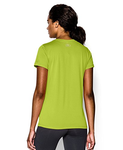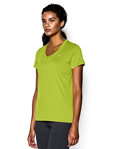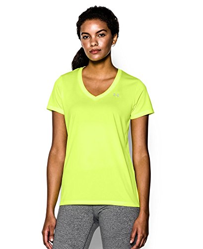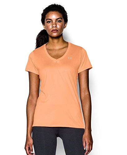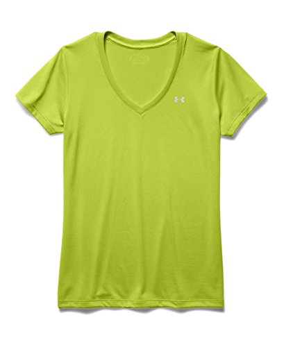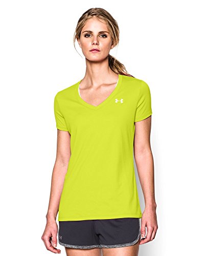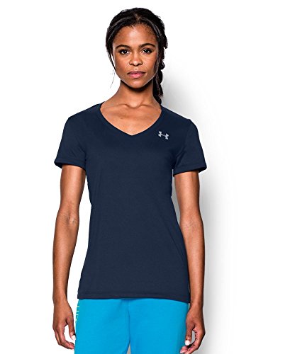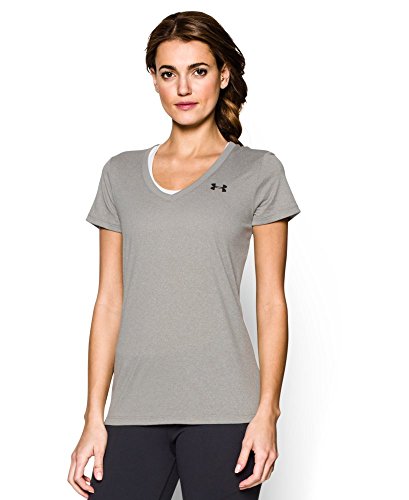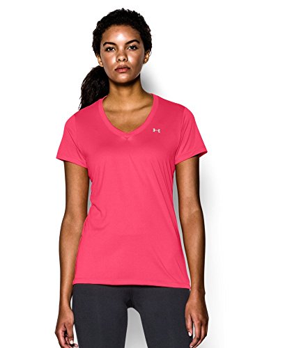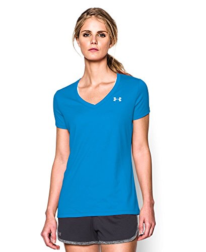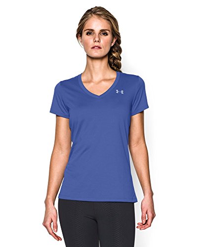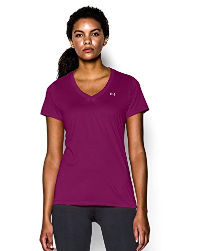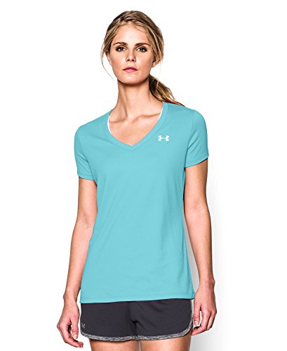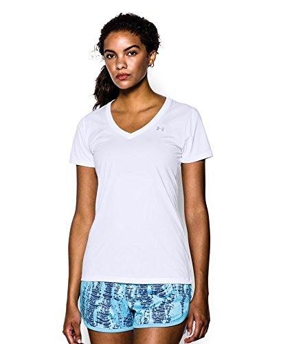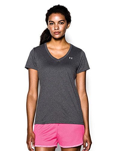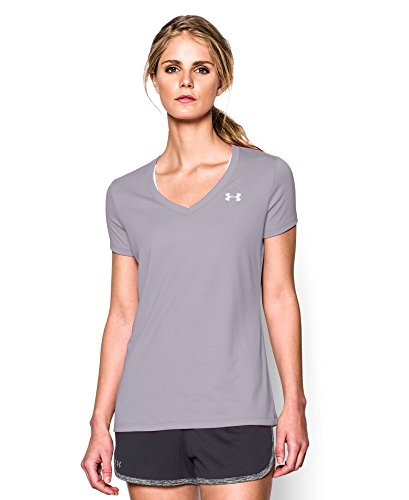 Ultra-light UA Tech™ fabric delivers a soft feel with Classic UA performance. Signature Moisture Transport System wicks sweat to keep you dry & light. Lightweight stretch construction improves mobility for full range of motion. Anti-odor technology keeps your gear fresher, longer. Deep V-neck collar & slimmer fit deliver a sleek, more feminine silhouette. Metallic silver front chest logo. Polyester. Imported.Feature