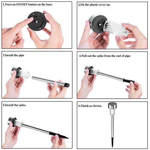 - EASY TO INSTALL: Unscrew the lamp cap, turn on the light switch, make the pieces together as picture shows, and directly insert it into soil to complete installation.The solar path lights automatically turn on at night and turn off at dawn!