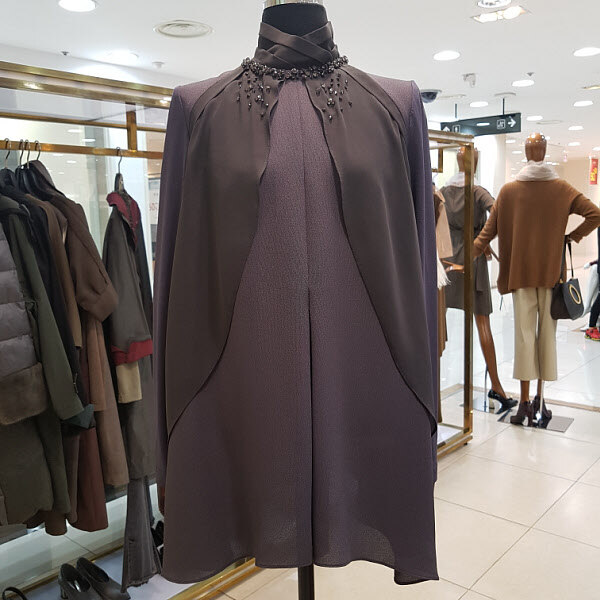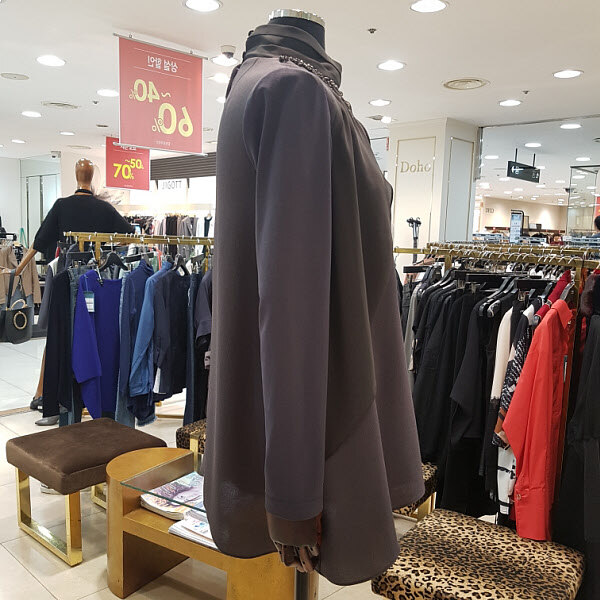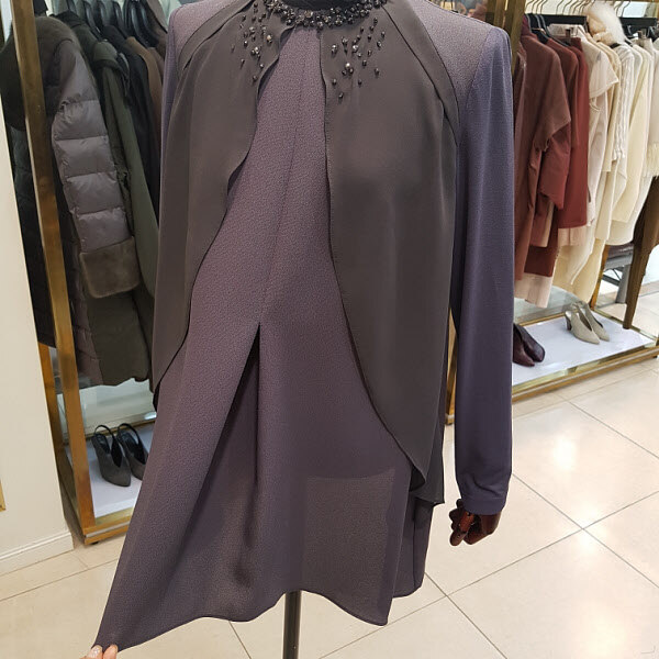 티셔츠에 쉬폰조끼를 입은듯한 분위기가 연출되는 블라우스디자인입니다.큐빅장식이 적당히 들어가서 자연스런 화려함이 느껴지며 소매부분이 신축성이 좋아서 활동성이 좋은 스타일입니다.