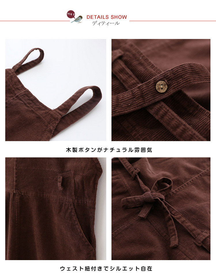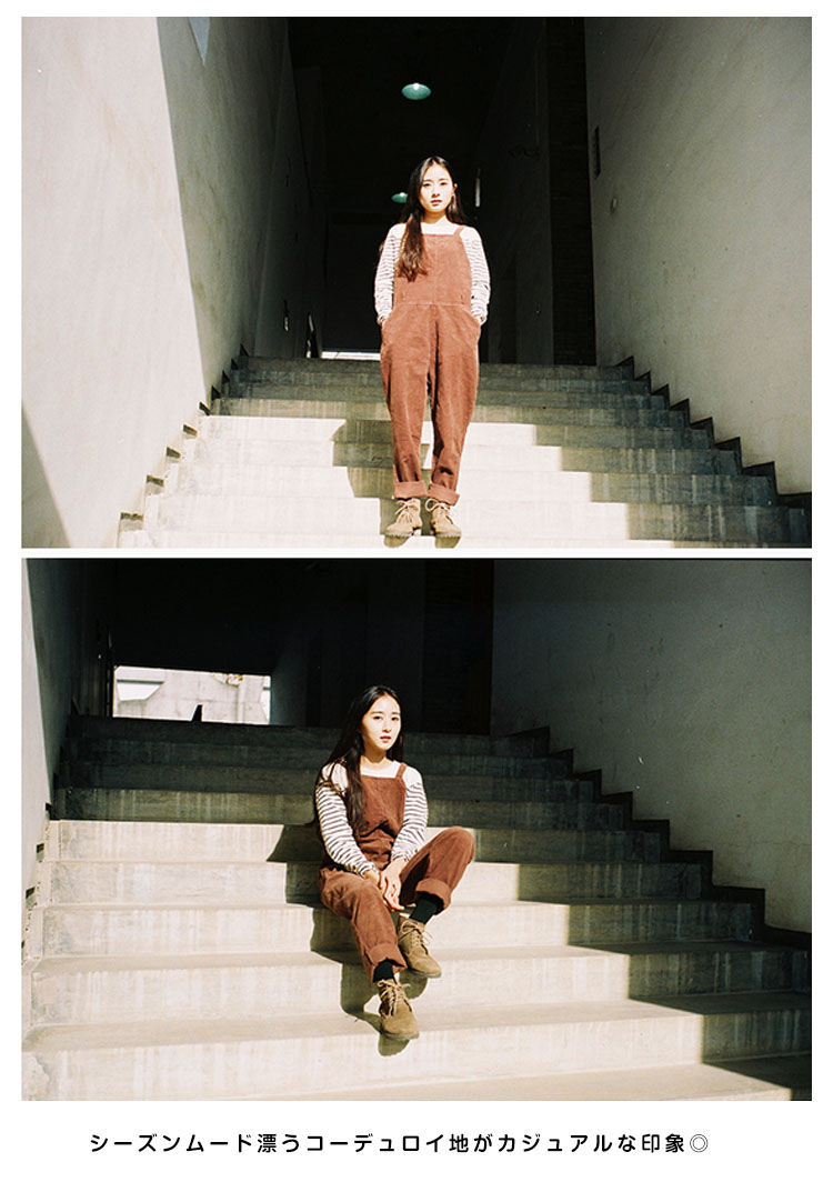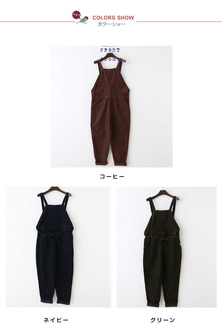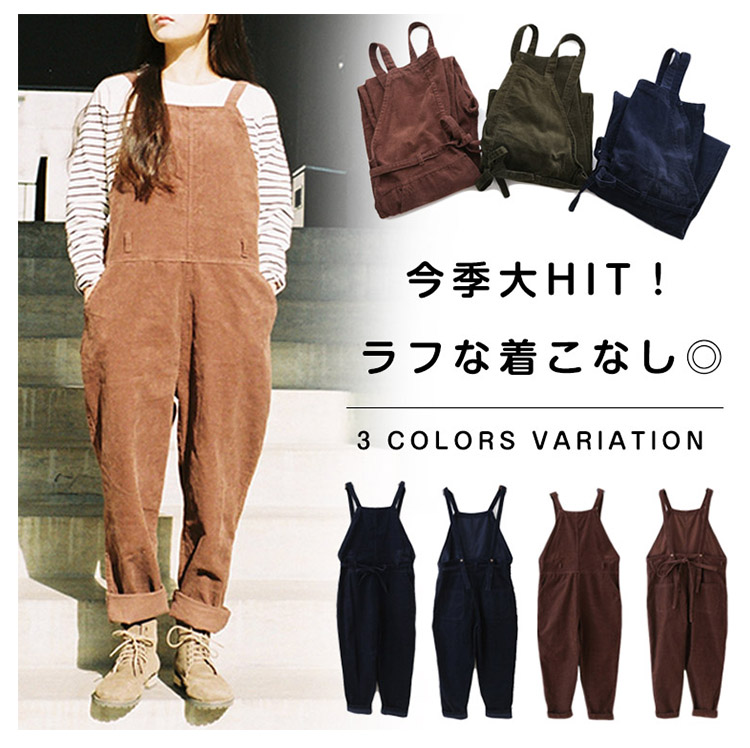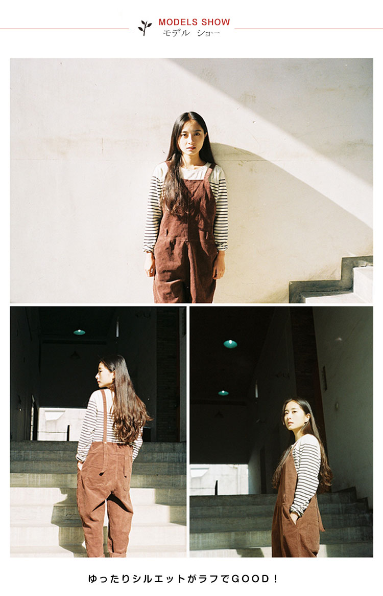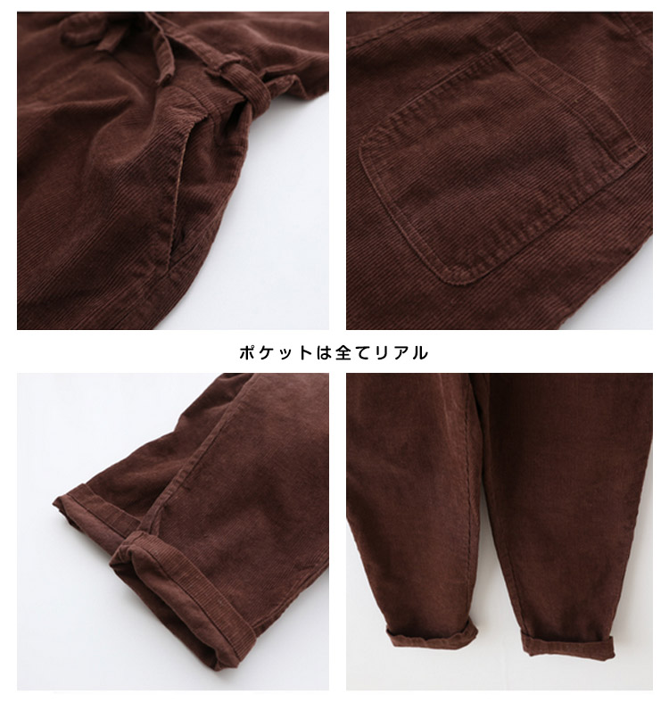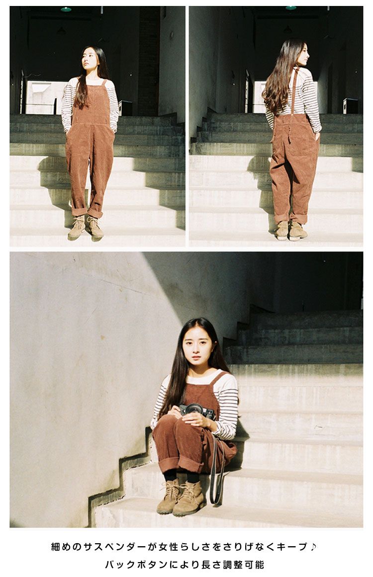 | 今季大HIT!ラフな着こなし◎ゆったりシルエットがラフでGOOD!シーズンムード漂うコーデュロイ地がカジュアルな印象◎細めのサスペンダーが女性らしさをさりげなくキープ♪バックボタンにより長さ調整可能ウェスト紐をキュっと締めるとレディースモード加速◎ | |
