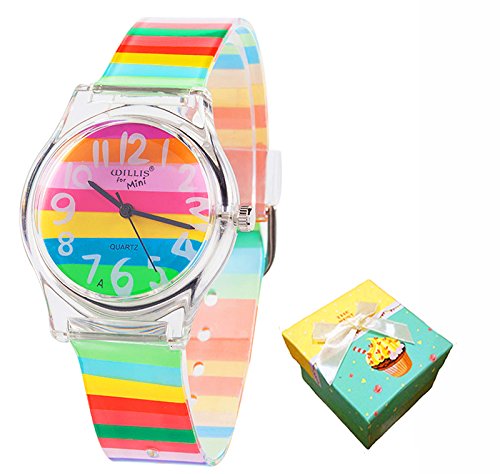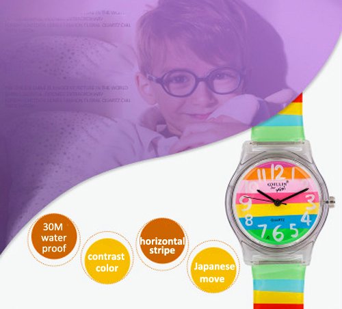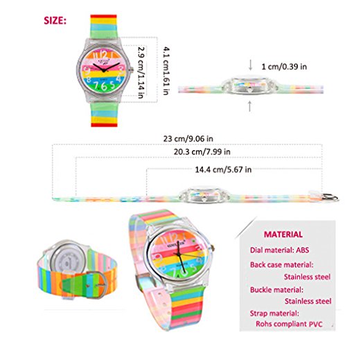 ADVANTAGE: 1.It is a classy and simply time piece with an accurate ♥Japanese analog quartz movement and strong power Japan Seiko button battery♥. 2.It is a beautiful fashion watch gift for your kids and friends.Suitable for age from 8 to 30. PRODUCT DETAILS: 1.Size & Weight Band length : 23cm / 9.06 in Band width : 1.7cm / 0.67 in Maximum wrist band: 20.3cm/7.99 in Minimum wrist band: 14.4cm/5.67 in Dial diameter : 3.4cm / 1.34 in Case thickness: 1cm /0.39 in Shape of the dial: Round Item weight : 40g / 1.41 oz 2.Material Mirror Surface: Highly Transparent Resin Glass Case material: ABS Caseback material: Stainless steel Strap material: Rohs listed PVC strap Buckle material: Stainless steel NOTE: Waterproof only in daily life .Splash/rain resistant. Not suitable for showering, bathing, swimming, snorkelling, water related work and fishing.Please Don't take this watch to swim or take shower. Avoid to put this watch on Too hot or Too cold place, Too much water contact will shorter this watch's life. Packaging: 1*watch 1*delicate watch box Pls check our store for more kids watches.We have dozens of kids watches for your choose!Feature