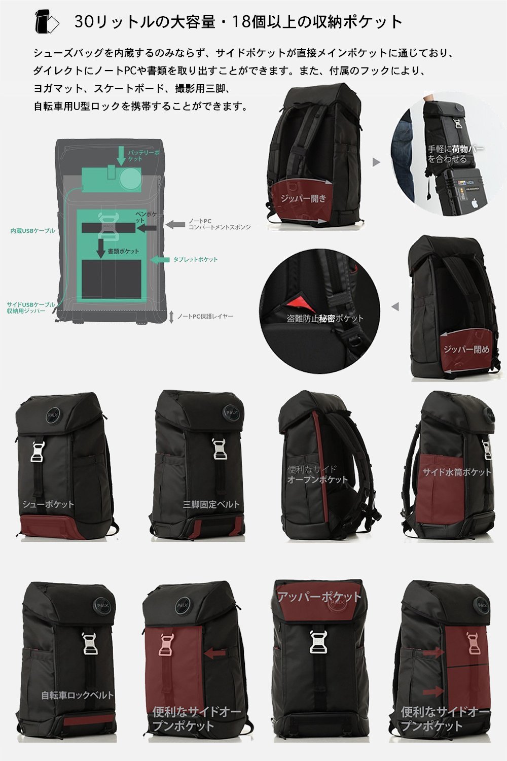 BACKPAIX connects your mobile charger to the built-in USB cable and you can easily charge it while moving from the side pocket.