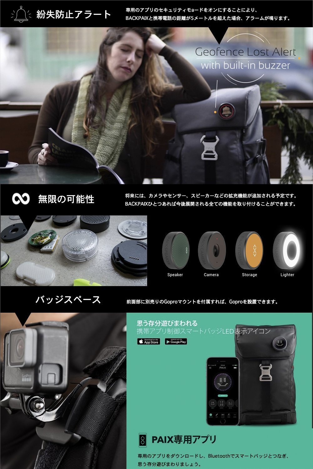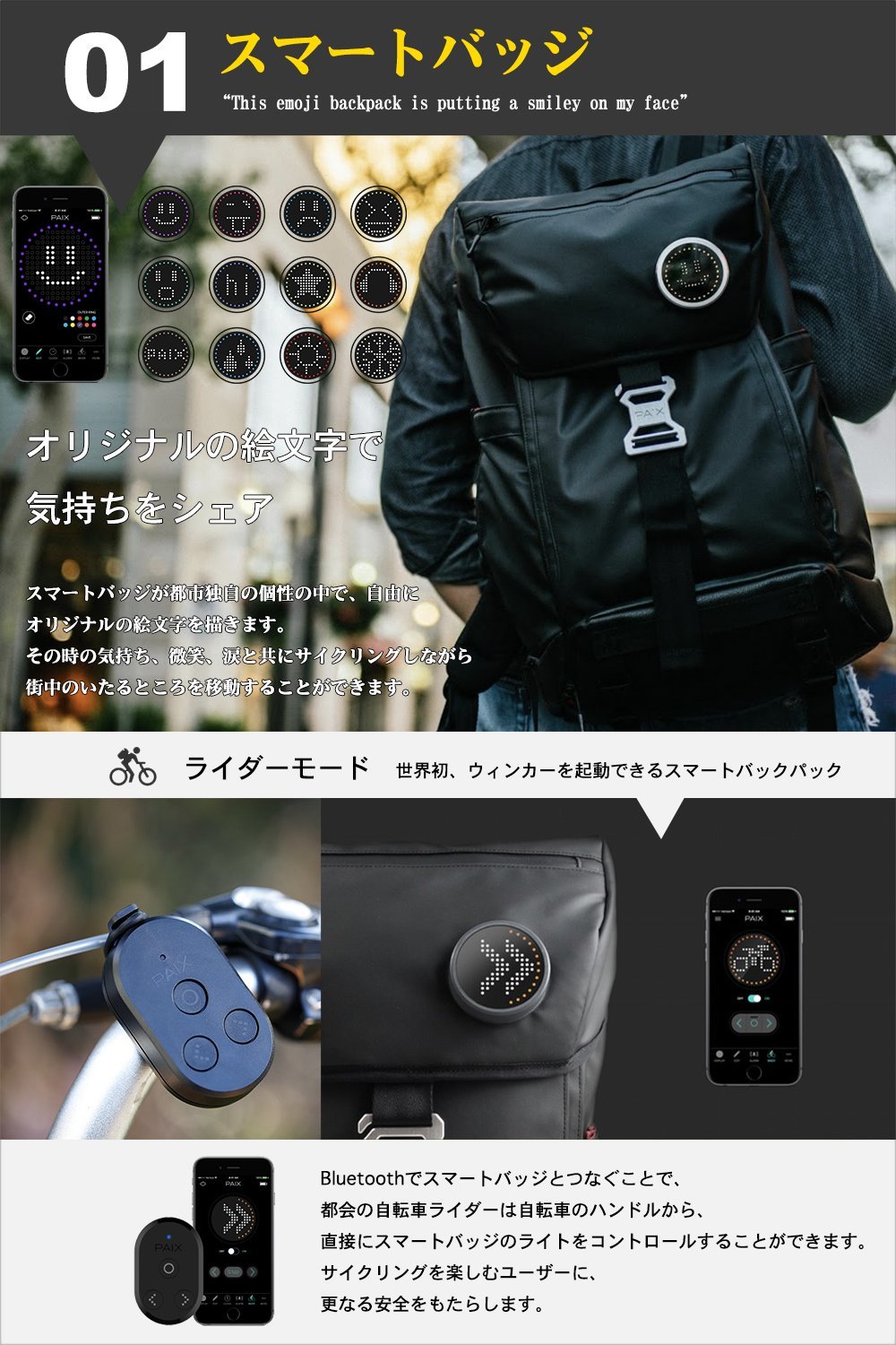BACKPAIX is equipped with an original design LED smart badge (※ option), from a dedicated application, turns a bicycle turn signal, has a function such as loss prevention alarm, supports your actions smartly.