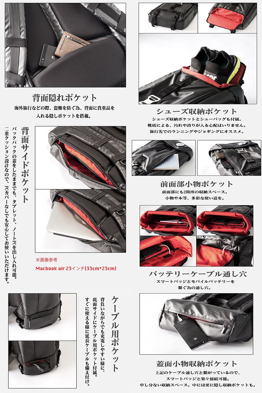 In addition to the built-in shoe bag, the side pocket directly leads to the main pocket, so you can take out the notebook PC and documents directly.