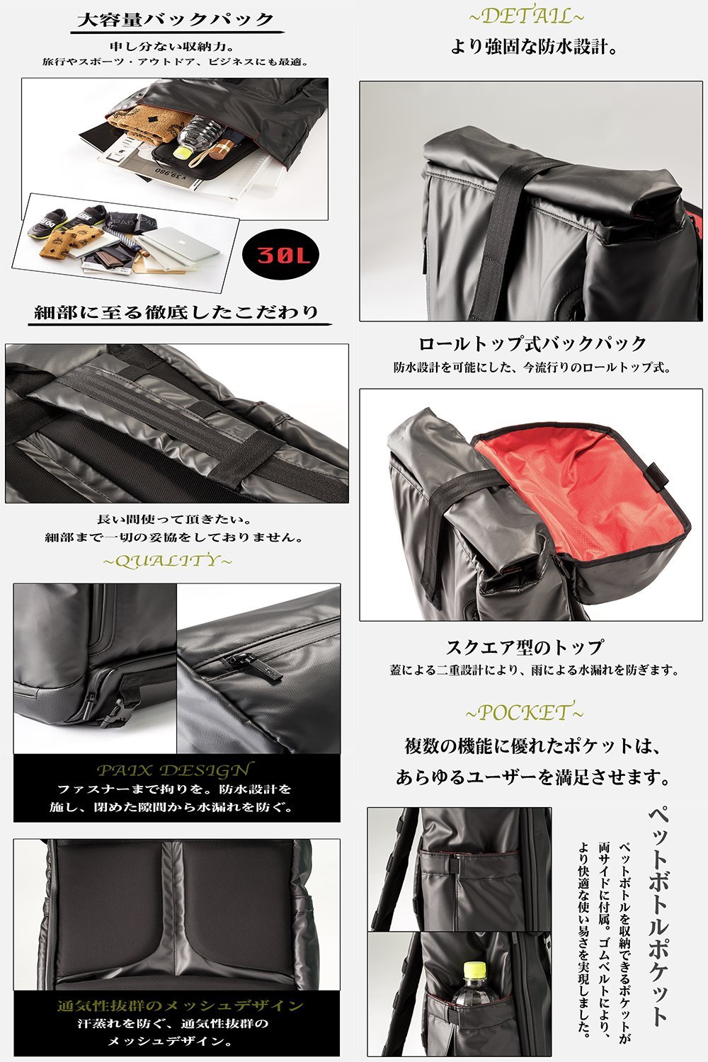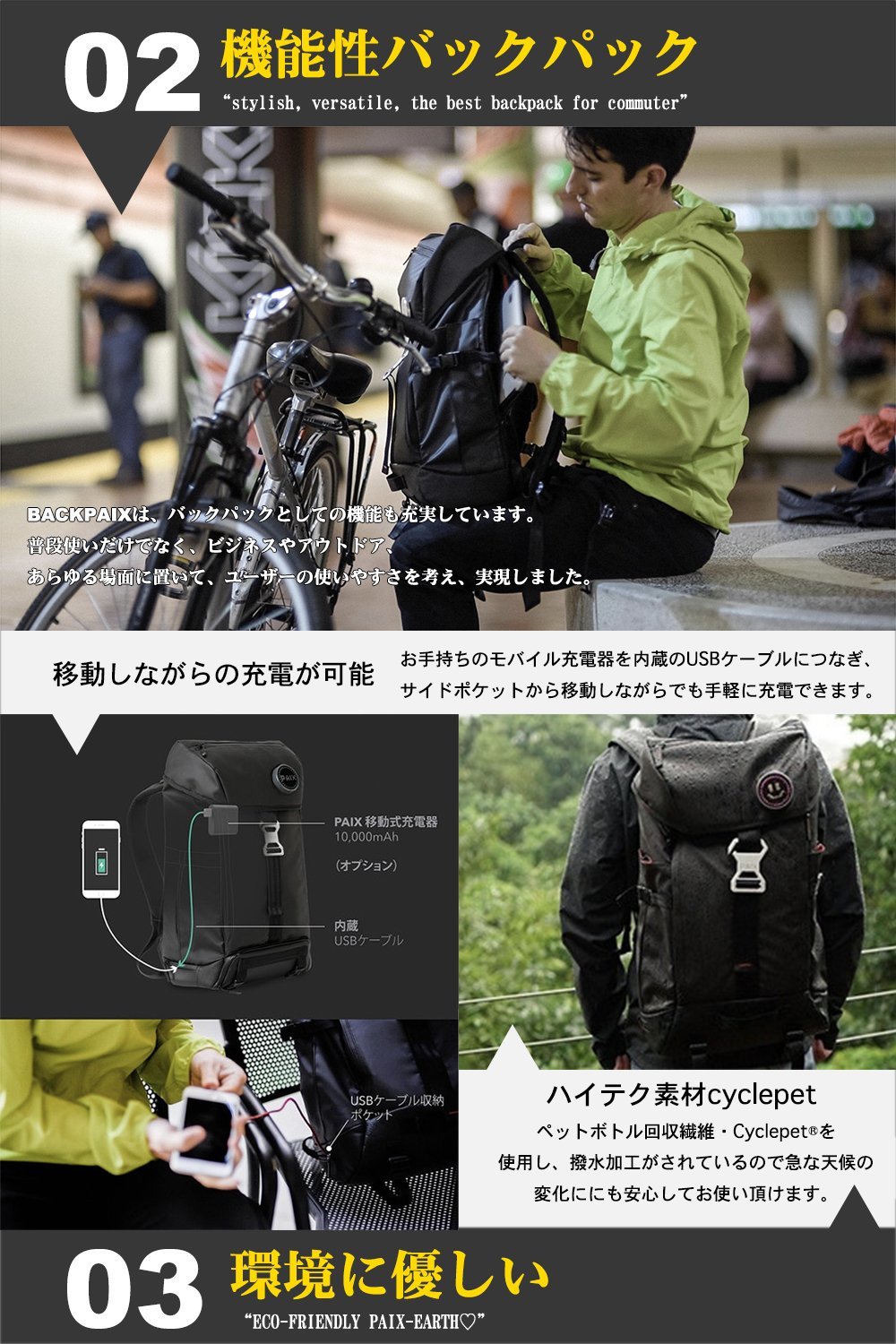 BACKPAIX uses PET bottle recovered fiber · Cyclepet and is water repellent finished, so you can use it with confidence in sudden weather change.