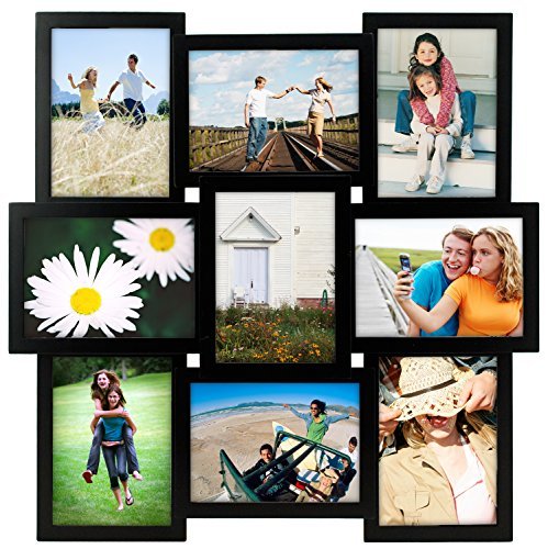 Our ebony black wood collage displays nine 5 by 7-Inch prints in a very contemporary design. Features a black hardwood stained moulding in a windowpane style to showcase your prints. Frame comes with wall mounts for easy wall hanging. Acid free backing for life-time care of your prints. Glare resistant glass lenses.Feature