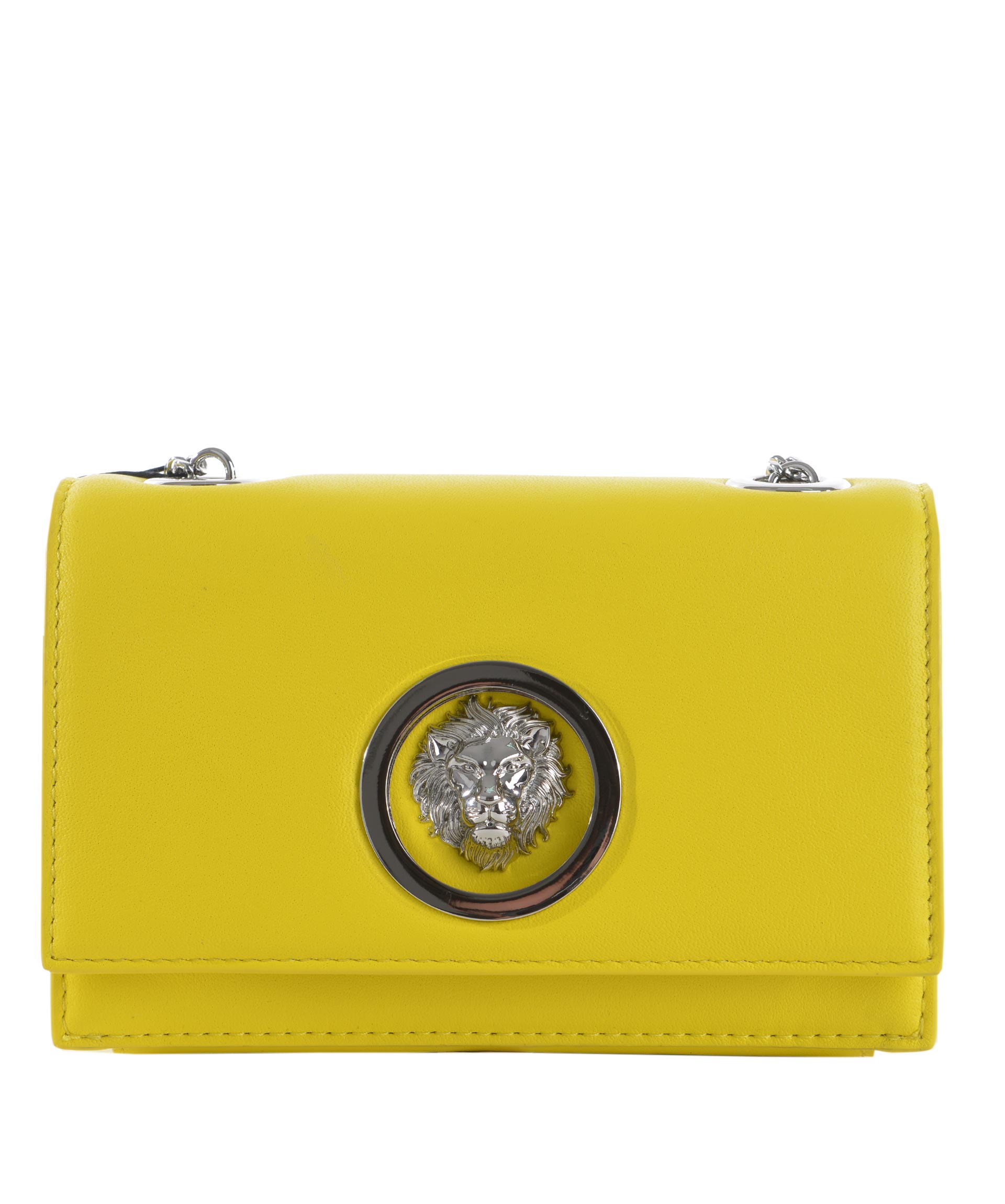 Borsetta Versus in nappa Gialla. Tracolla a catena argento. Patta frontale con oblò e logo "testa di leone" in metallo argentato. Chiusura a calamita. Tasca interna. Foderata. Misure: altezza 10,5 cm, larghezza 16 cm, profondità 6 cm 100% pelle
