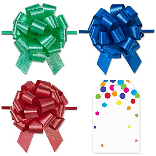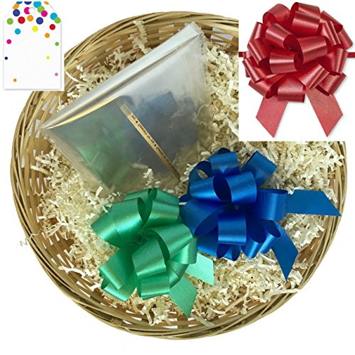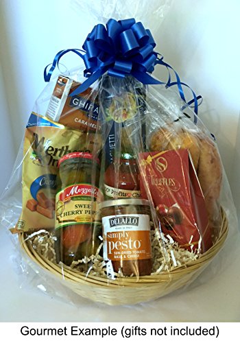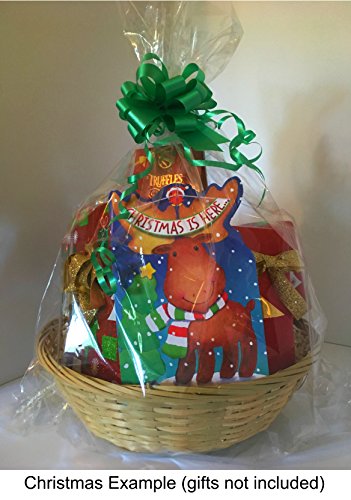 This all occasion empty gift basket kit from Cabin Creek Boutique contains: ? One 12" diameter, round, woven wicker basket made from bamboo. Reusable in the kitchen for serving food, and for storage in any room of the house. ? 4 oz. ivory color paper shred filler ? 20x24" crystal clear cellophane bag ? 1 twist tie printed with the words "Especially for You" ? 1 gift tag and 3 pull bows--- choose either the kit with white, gold, and yellow bows and scroll tag, or the one with blue, green, and red bows and dot tag. For all occasions: Birthday, Christmas, Easter, Wedding, Baby, Spa, Homemade Gifts for Women, DIY Gifts for Men, Office, Corporate, Coworker