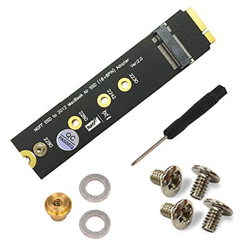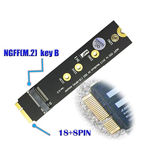 Studio : SUPERPLUS Publisher : SUPERPLUS Binding : Electronics Product Description NGFF SSD to 18 8 pin SSD adapter for 2012 MacBook Air A1465 A1466 Features: 1:The adapter only supports 2012 version Apple MacBook Air,the model includes A1465 A1466 (MD223 MD224 MD231 MD232). 2: This adapter installed the NGFF SSD can replace original APPLE SSD, can install the MAC OS or Windows OS. 3. The adapter dimension is the same as SSD of original APPLE SSD (LxW:109X24mm). 4. No additional driver is needed. 5: The adapter card only supports 22x42/22x60/ 2280 size of M.2 NGFF (SATA) SSD, it does not support PCIe X2 or PCIe X4 transfer mode of SSD, About M.2 NGFF SSD interface standard: 1.Socket 2(B M key):there are SATA(such as THNSNH128G8NT/ THNSNH128GDNT/MZNTD256HAGM models of SSD) and PCIe X2(such as PX-AG128M6E/PX-AG128M6E/SD6PP4M models of SSD) two different transfer mode. 2.Socket 3(M key):PCIe X4(such as MZHPU128HCGM and MZHPU512HCGL models of SSD) transfer mode. About MacBook Air SSD interface standard: 1: 2010 and 2011 version MacBook Air SSD is 6 12 pin, the dimension is 109 x24 mm(SATA-bus interface 2: 2012 version MacBook Air SSD is 8 18 pin, the dimension is 109x 24 mm(SATA-bus interface) 2012 version MacBook Pro SSD is 8 18 pin, the dimension is 89 x33 mm(SATA-bus interface) 3: 2013 and 2014 and 2015 version MacBook Air SSD include two sides golden-finger, one side is 16 12 pin, the other side is 11 14 pin, the dimension is 89 mm*24 mm. It's PCIe X4 bus interface. 4: 2013 and 2014 and 2015 version MacBook Pro SSD include two sides golden-finger, one side is 16 12 pin, the other side is 11 14 pin , the dimension is 89x33 mm. It's PCIe X4 bus interface.