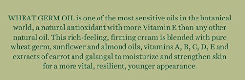 -. Feature : This rich-feeling firming cream is blended with pure wheat germ / Sunflower, almond oil, vitamins A, B, C, D, E and extracts of carrot and galangal to moisturize and strengthen skin for a more vital / Resilient and younger appearance. / Gently smooth over cleansed face and body with upward strokes, morning and evening.