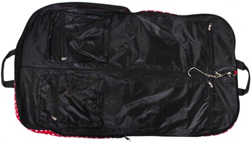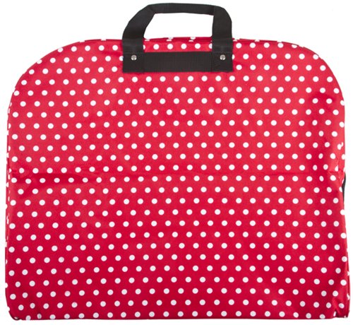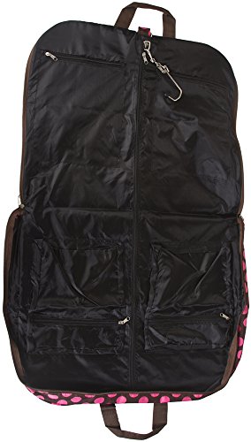 -. Brand : World Traveler -. Department : womens -. Feature : Metal hook for hanging multiple pieces of clothing / 4 interior zippered pockets for shoes, accessories etc. / One exterior zippered pocket / Bag will bifold, with top carry handle to perform as a carry on / Durable lightweight fabric -. ProductGroup : Apparel -. ProductTypeName : LAGE -. Size : One Size -. Title : World Traveler Polka Dot Collection 40-inch Hanging Garment Bag