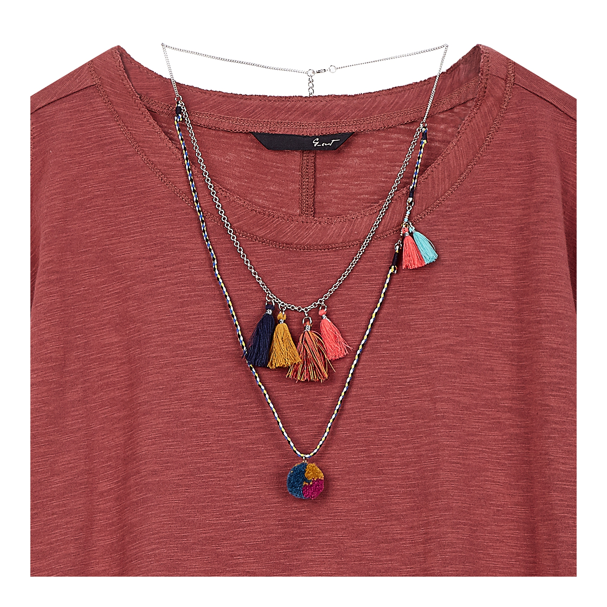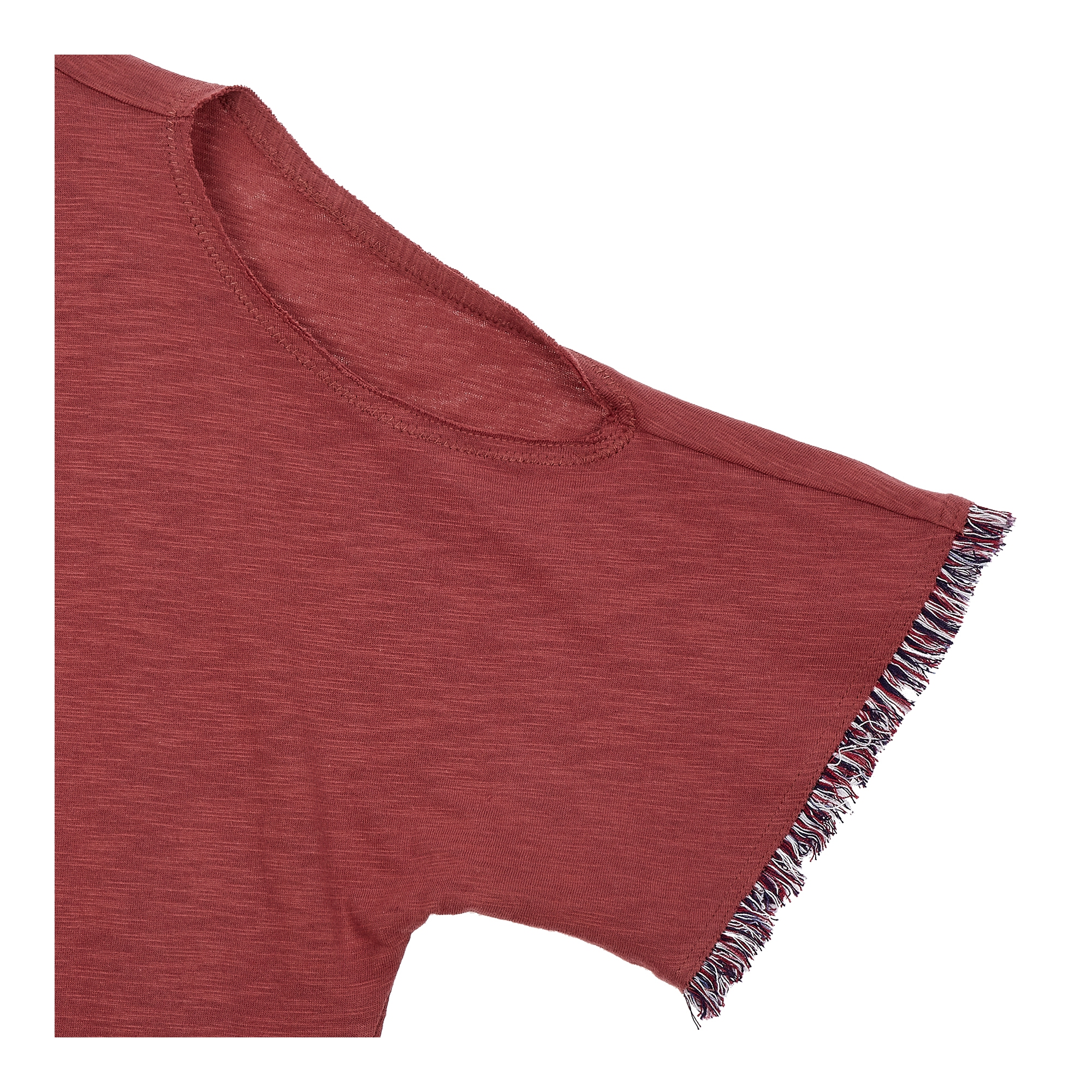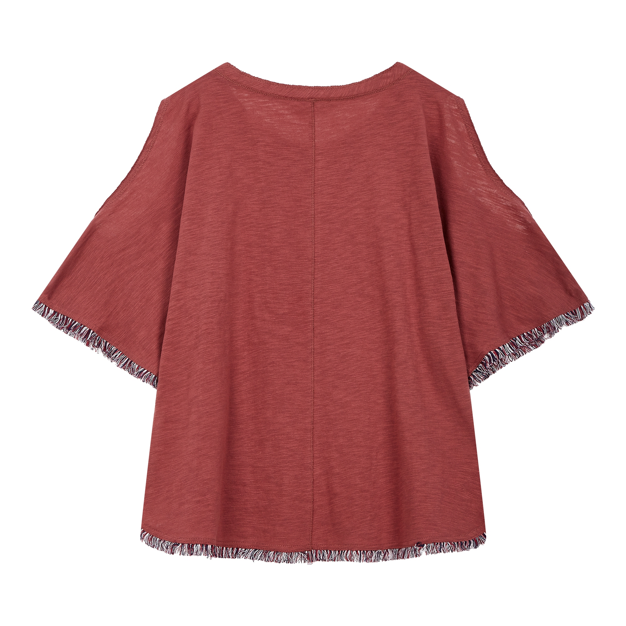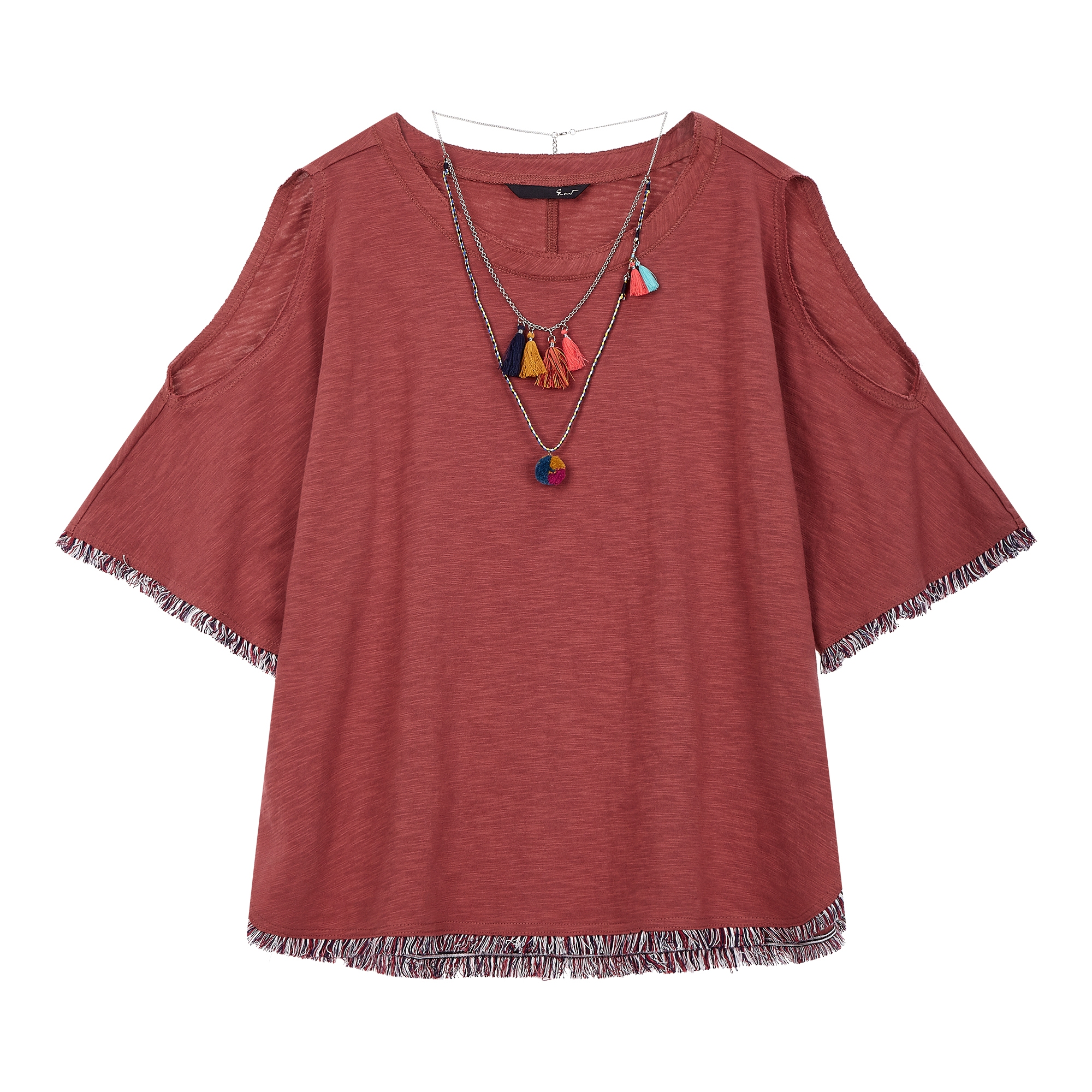 컬렉션 : 2018 Spring/Summer 디자인 포인트 : - 어깨 부분에 트임 디테일이 돋보이는 트렌디한 무드의 티셔츠- 밑단 프린지 장식 디테일로 포인트를 더한 디자인- 태슬 목걸이와 세트 구성의 캐주얼한 아이템 스타일링 추천 : 베이직한 스키니진 혹은 부츠컷 팬츠와 트렌디한 스타일링을 할 수 있음