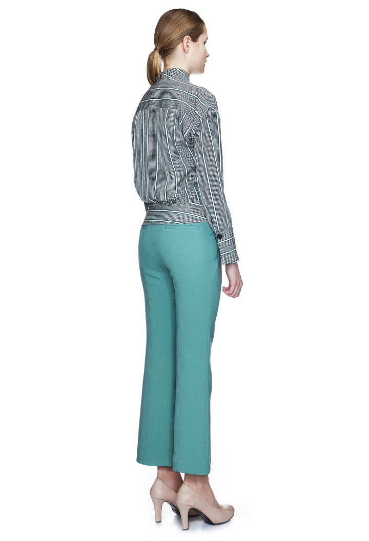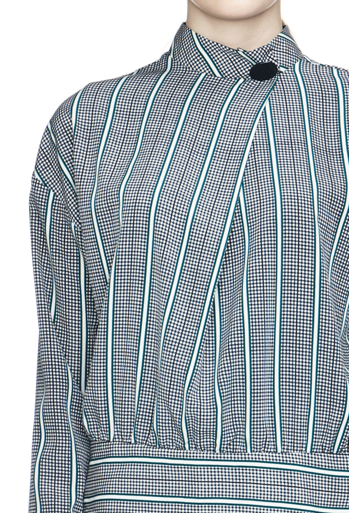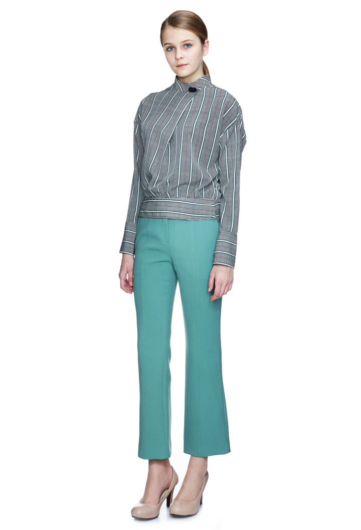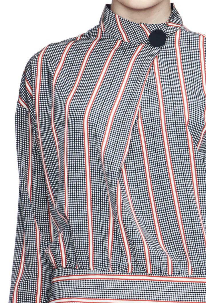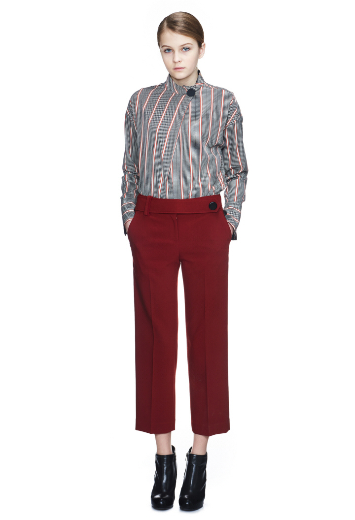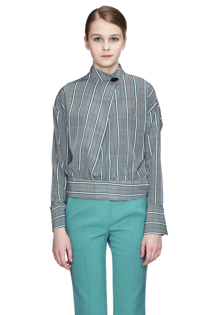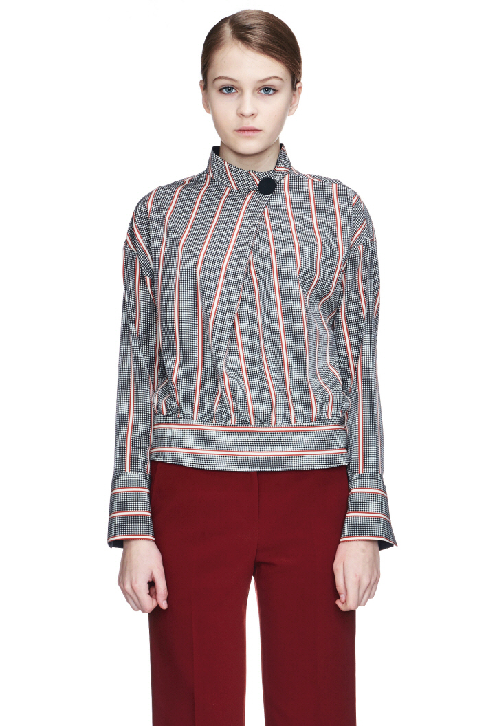 잔잔한 스트라이프 패턴이 고급스러운 아이템으로 하이넥 디자인과 버튼장식이 포인트입니다.