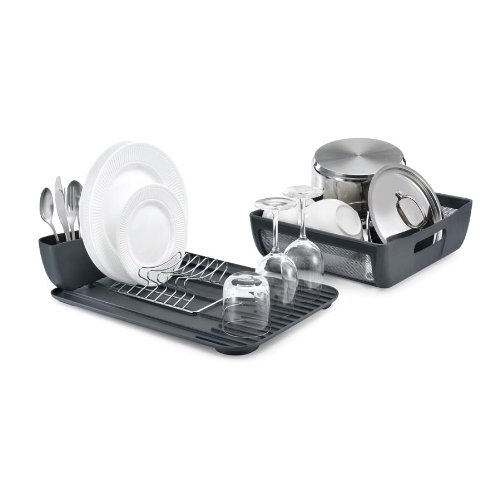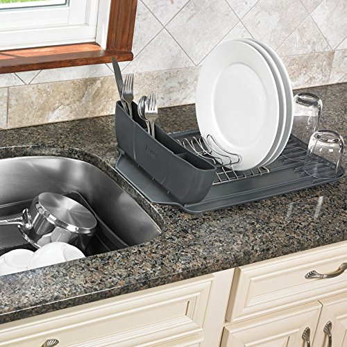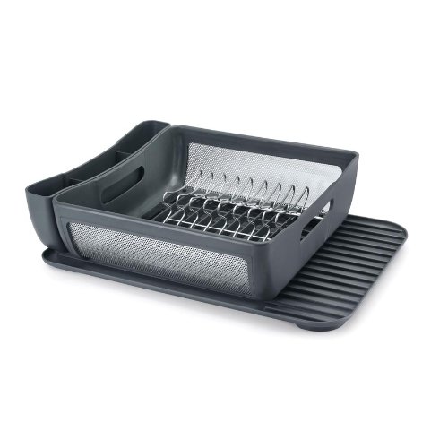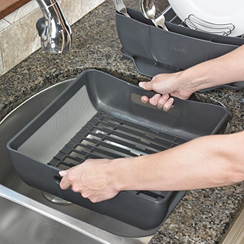-. Feature : Hybrid size expands to handle multiple drying needs / Elegant design, stainless steel and plastic construction / Doubles drying space, main tray lifts off base to double storage space / Large glass drying platform with ribs for water run off / Expansive utensil bin with three split compartments