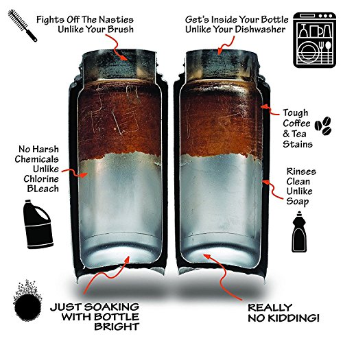 WASH WHILE YOU SLEEP - Cleans in 15-30 minutes or for tough stains, use hot water and let stand for 1-8 hours. Only requires warm to hot water to clean bottles, caps, lids, straws and bottle exteriors. Even removes old coffee stains and leaves your bottle looking brand new