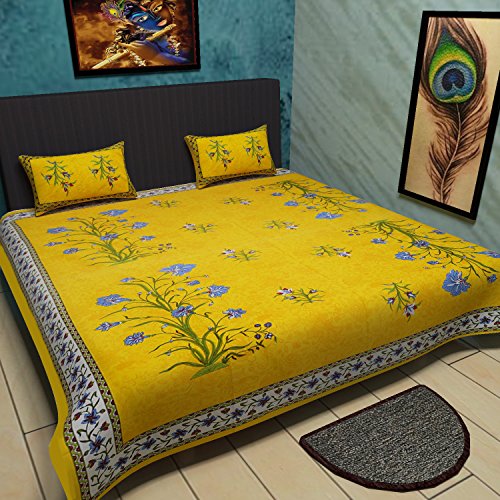 Traditional Mafia Wild Flower Collection 100% pure Cotton Printed double King Size Bedsheet with 2 pillow Covers, Yellow