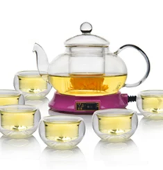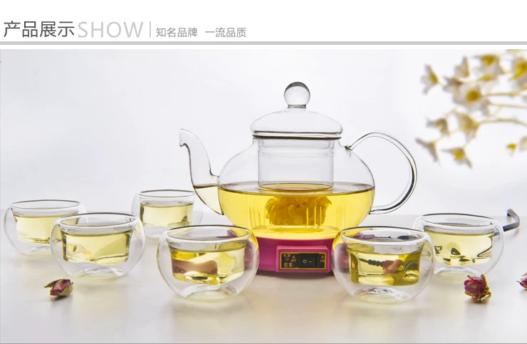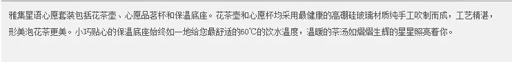 这款玻璃茶具套装非常适合家人朋友相聚时使用,600ml的大容量,多人小聚品茗应付自如,配合心形的品茶杯,精致温馨。一壶花茶,一段美丽的时光。