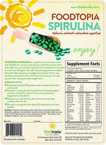 - Feature : FEEL GOOD TAKING DAILY NUTRIENTS IN ONE EASY TO TAKE TABLET. Contains a ariety of vitamins and minerals including beta carotene, vitamin E, vitamin C, iron, zinc, potassium, magnesium and calcium. / MOST POTENT SPIRULINA FOR HIGHEST IMPACT ON YOUR BODY. Per gram our spirulina has about 26 times more beta carotene than carrots. Per gram our spirulina has about 20 times more iron than spinach. / BOOST YOUR IMMUNE SYSTEM AND ENERGY. Supports cardiovascular health, supports eye & brain health, boosts energy, boosts immunity, and more. / INCREDIBLE 60% PROTEIN TO FUEL YOUR BODY. Extremely high protein count and contains all essential amino acids. / BUY THE CLEANEST & HIGHEST QUALITY PRODUCT TODAY OR YOUR MONEY BACK. We have sourced clean Spirulina form isolated farms located in rural Inner Mongolia. Best form of Spirulina you can buy.