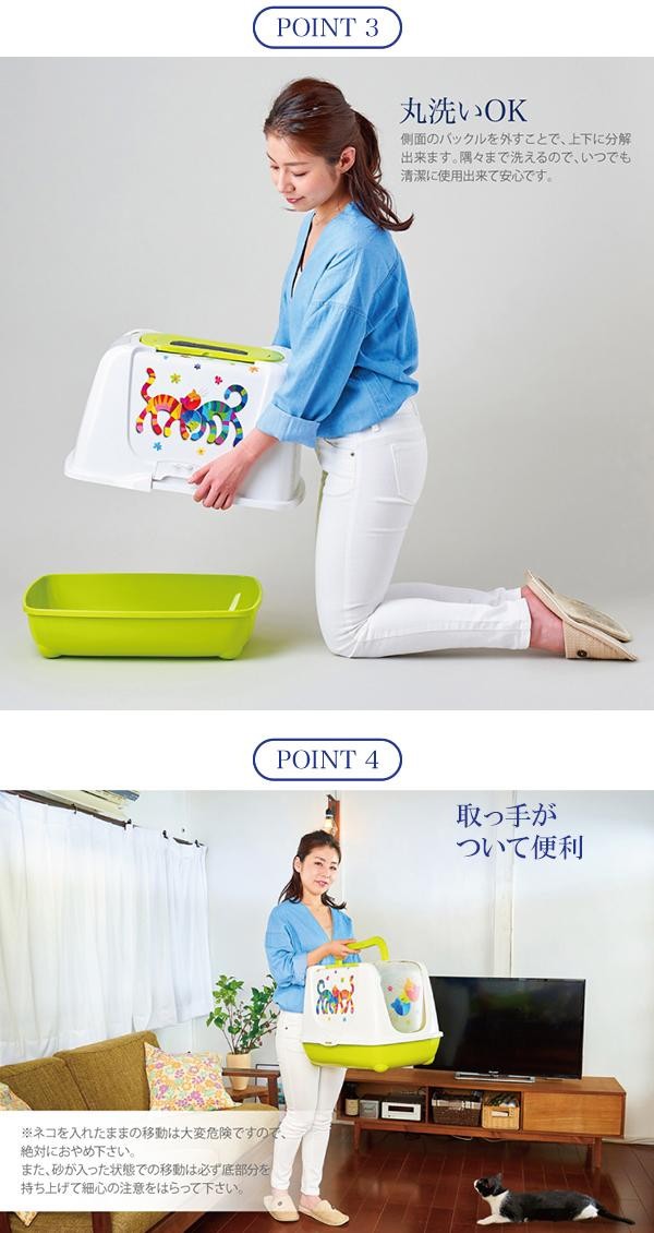 ボディ表面に模様が入ったインテリア性の高いネコトイレです。フード付きで更に扉もついているので、砂やニオイが漏れにくくなっています。側面のバックルを外すことで、上下に分解して丸洗いも出来ます。 |