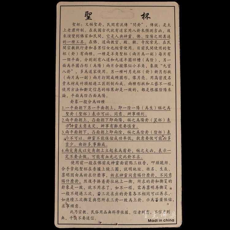 圣杯有称阴阳杯,外(正)面凸,里(反)面平 凸面为阳,平面为阴 平常是摆在佛台上,供信徒平时求神卜卦所用。 |